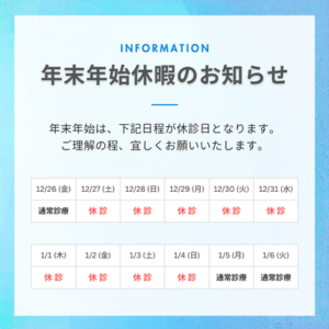 2025年12月27日(土)から2026年1月4日(日)まで休診とさせていただきます。